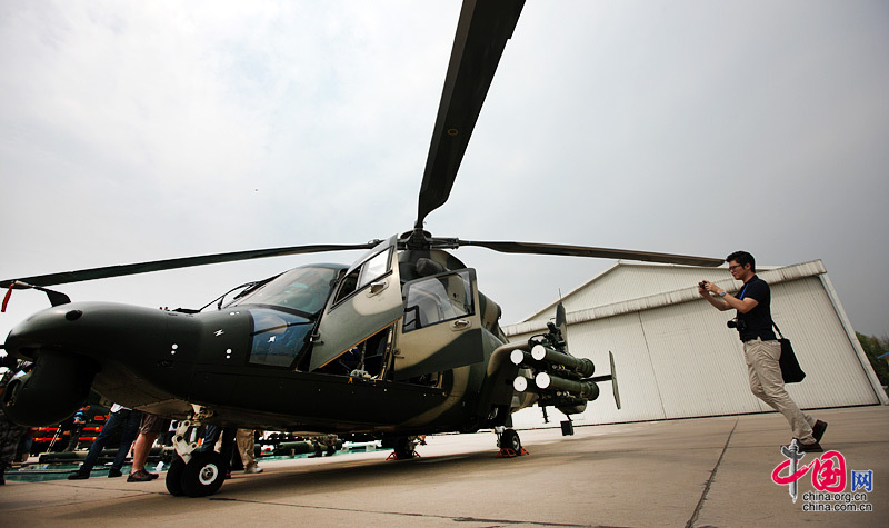 一名記者正在拍攝靜態(tài)展示區(qū)的直9-WZ武裝直升機(jī)。 攝影:中國網(wǎng) 楊佳