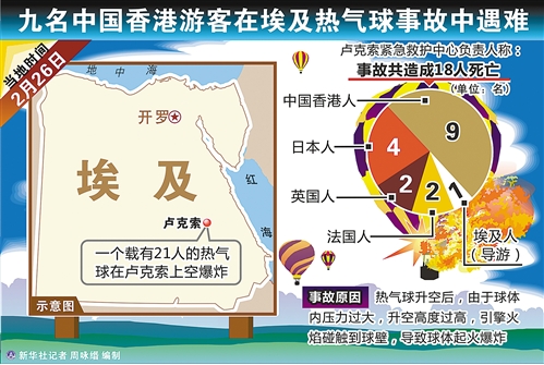 2月26日,在盧克索附近,救援人員在發生熱氣球爆炸的事故現場查看熱氣球殘骸。