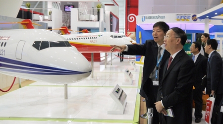 在中國商飛公司展區(qū),蘇波認(rèn)真察看了C919大型客機(jī)混合級(jí)布局以及ARJ21-700飛機(jī)混合級(jí)、全經(jīng)濟(jì)級(jí)、行政機(jī)和公務(wù)機(jī)布局模型,聽取了公司兩大型號(hào)的最新研制進(jìn)展、能力建設(shè)、人才隊(duì)伍建設(shè)、國際合作、民機(jī)產(chǎn)業(yè)體系建設(shè)等方面情況的匯報(bào)。蘇波表示,中國商飛公司成立5年來取得的成績令人鼓舞,工信部將一如既往地支持中國商飛公司的發(fā)展建設(shè),希望中國商飛公司再接再厲、奮力拼搏,爭取早日取得大型客機(jī)項(xiàng)目的成功。