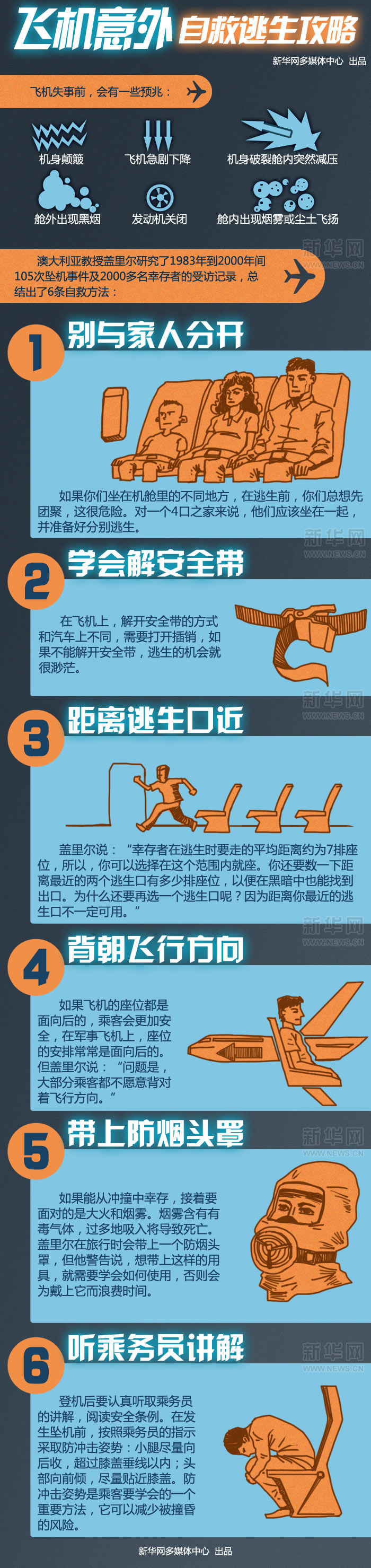 澳大利亞教授蓋里爾研究了1983年到2000年間105次墜機事件、2000多名幸存者的受訪記錄,總結出6條自救方法。