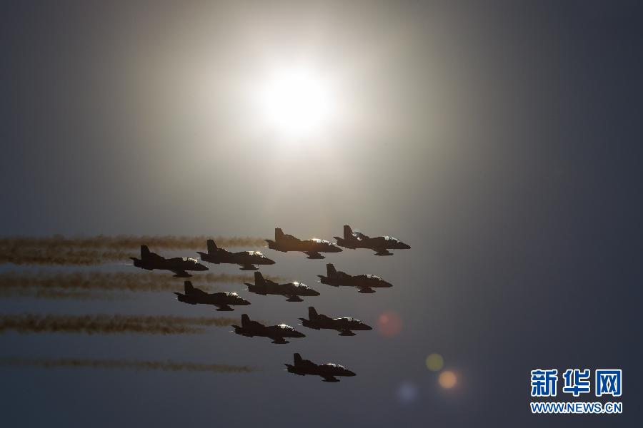 8月3日,在匈牙利中部的凱奇凱梅特空軍基地,來自意大利空軍的“三色箭”飛行表演隊在匈牙利國際航空展上表演。  新華社發(弗爾季·奧蒂洛攝)