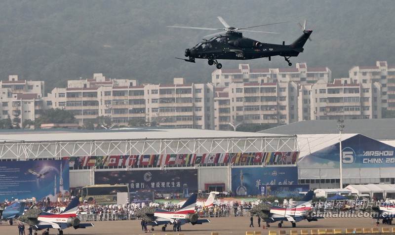 我國自主研制生產的武直-10武裝直升機亮相在珠海舉行的第九屆中國國際航空航天博覽會,在飛行表演中展示了這款直升機的優良性能。