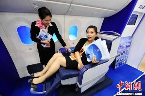 5月29日,日本全日空航空公司(ANA)在首屆中國(北京)國際服務貿易交易會(“京交會”)上展示該公司訂購的全球首架波音787“夢想客機”的模擬客艙,參觀者可以親身體驗舒適的座椅。(圖:侯宇攝)