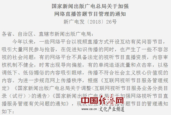 今年以來,一些網絡平臺以視頻直播方式開設互動有獎問答節目,吸引大量網民參與搶答,在促進知識傳播的同時,也產生了一些不容忽視的社會問題:有的網絡平臺不具備法定的視聽節目直播資質,內容審核機制不健全,時常出現導向偏差,有的單純追逐流量和點擊率,以格調低下、低俗媚俗的內容吸引眼球,傳播不符合社會主義核心價值觀的內容。為進一步規范網上傳播秩序,根據《互聯網視聽節目服務管理規定》《國家新聞出版廣電總局關于調整<互聯網視聽節目服務業務分類目錄(試行)>的通告>《國家新聞出版廣電總局關于加強網絡視聽節目直播服務管理有關問題的通知》,現就加強網絡直播答題節目的管理通知如下: