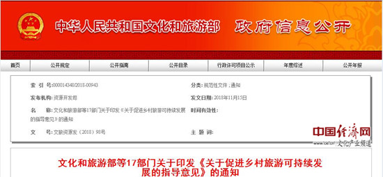 經濟日報-中國經濟網北京12月11日訊 為深入貫徹落實《中共中央 國務院關于實施鄉村振興戰略的意見》(中發〔2018〕1號)和《鄉村振興戰略規劃(2018-2022年)》,推動鄉村旅游提質增效,促進鄉村旅游可持續發展,加快形成農業農村發展新動能,近日文化和旅游部等17部門聯合印發《關于促進鄉村旅游可持續發展的指導意見》(以下簡稱《意見》),《意見》提出,到2022年,旅游基礎設施和公共服務設施進一步完善,鄉村旅游服務質量和水平全面提升,富農惠農作用更加凸顯,基本形成布局合理、類型多樣、功能完善、特色突出的鄉村旅游發展格局。
