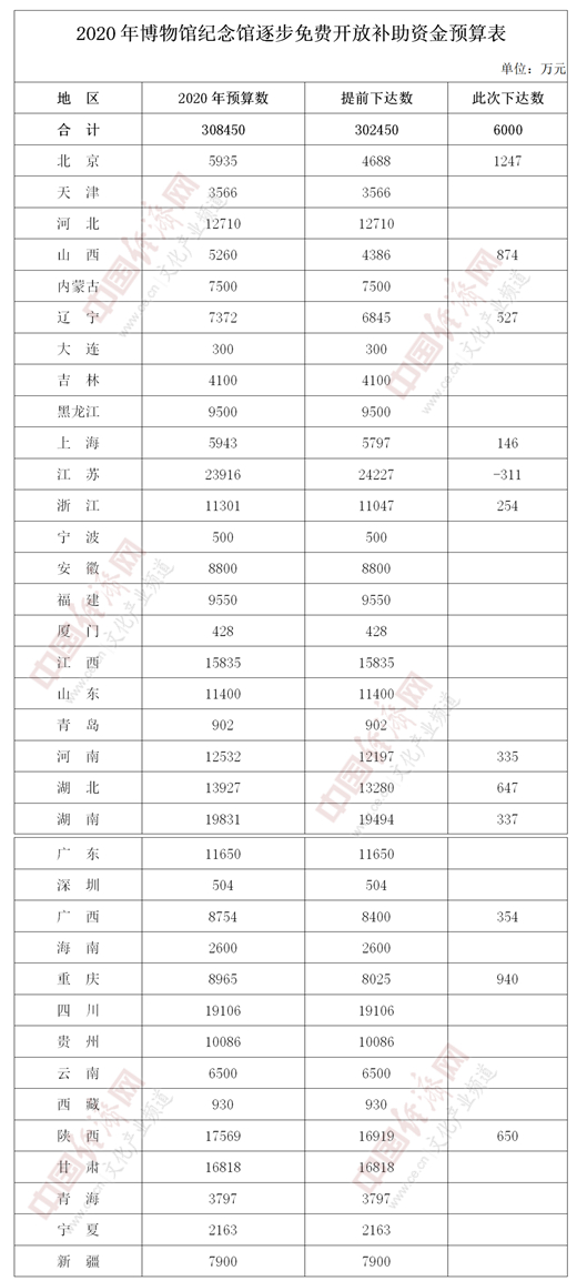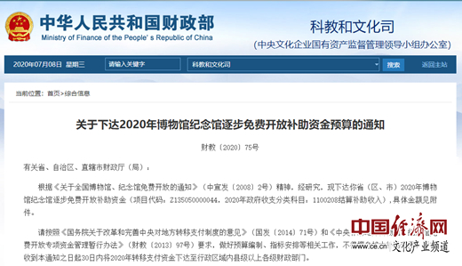 經濟日報-中國經濟網北京7月8日訊 7日,國家財政部官網發布《關于下達2020年博物館紀念館逐步免費開放補助資金預算的通知》(以下簡稱《通知》),《2020年博物館紀念館逐步免費開放補助資金預算表》同日公布。