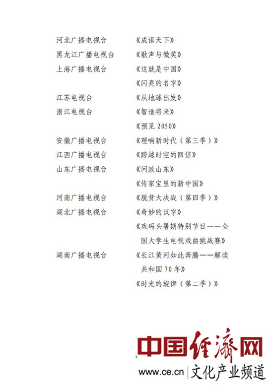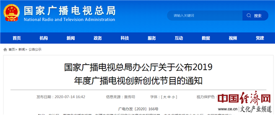 經(jīng)濟(jì)日報(bào)-中國經(jīng)濟(jì)網(wǎng)北京7月15日訊 7月14日,國家廣播電視總局公布了2019年度廣播電視創(chuàng)新創(chuàng)優(yōu)節(jié)目。
