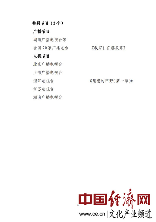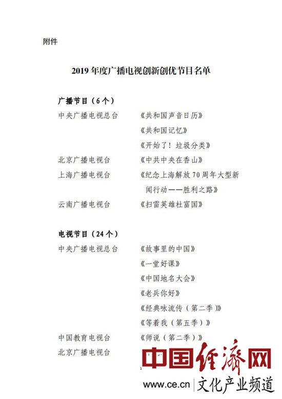 經(jīng)評議,國家廣播電視總局確定中央廣播電視總臺《共和國聲音日歷》、北京廣播電視臺《中共中央在香山》等6個(gè)廣播節(jié)目,中央廣播電視總臺《故事里的中國》《中國地名大會(huì)》、上海廣播電視臺《這就是中國》、江蘇電視臺《從地球出發(fā)》等24個(gè)電視節(jié)目為“2019年度廣播電視創(chuàng)新創(chuàng)優(yōu)節(jié)目”,每個(gè)節(jié)目給予5萬元的資金扶持;確定《我家住在解放路》《思想的田野》2個(gè)集體創(chuàng)作的節(jié)目為“2019年度廣播電視創(chuàng)新創(chuàng)優(yōu)特別節(jié)目”。