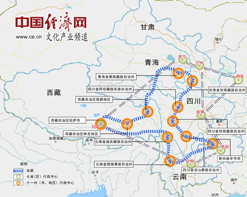 藏羌彝文化產(chǎn)業(yè)走廊依托的城市樞紐包括:四川省成都市、貴州省貴陽(yáng)市、云南省昆明市、西藏自治區(qū)拉薩市、陜西省西安市、甘肅省蘭州市和青海省西寧市。
