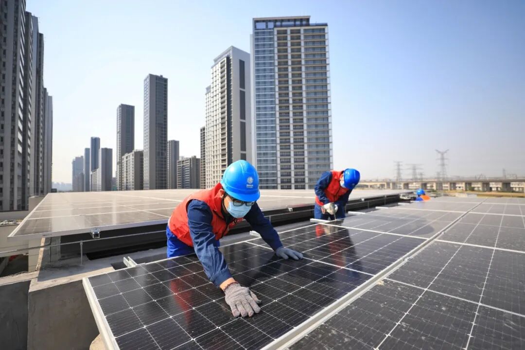 ▲國網杭州市蕭山區供電公司員工為杭州亞運村運動員村小學屋頂光伏進行維護。姚靖霖 攝