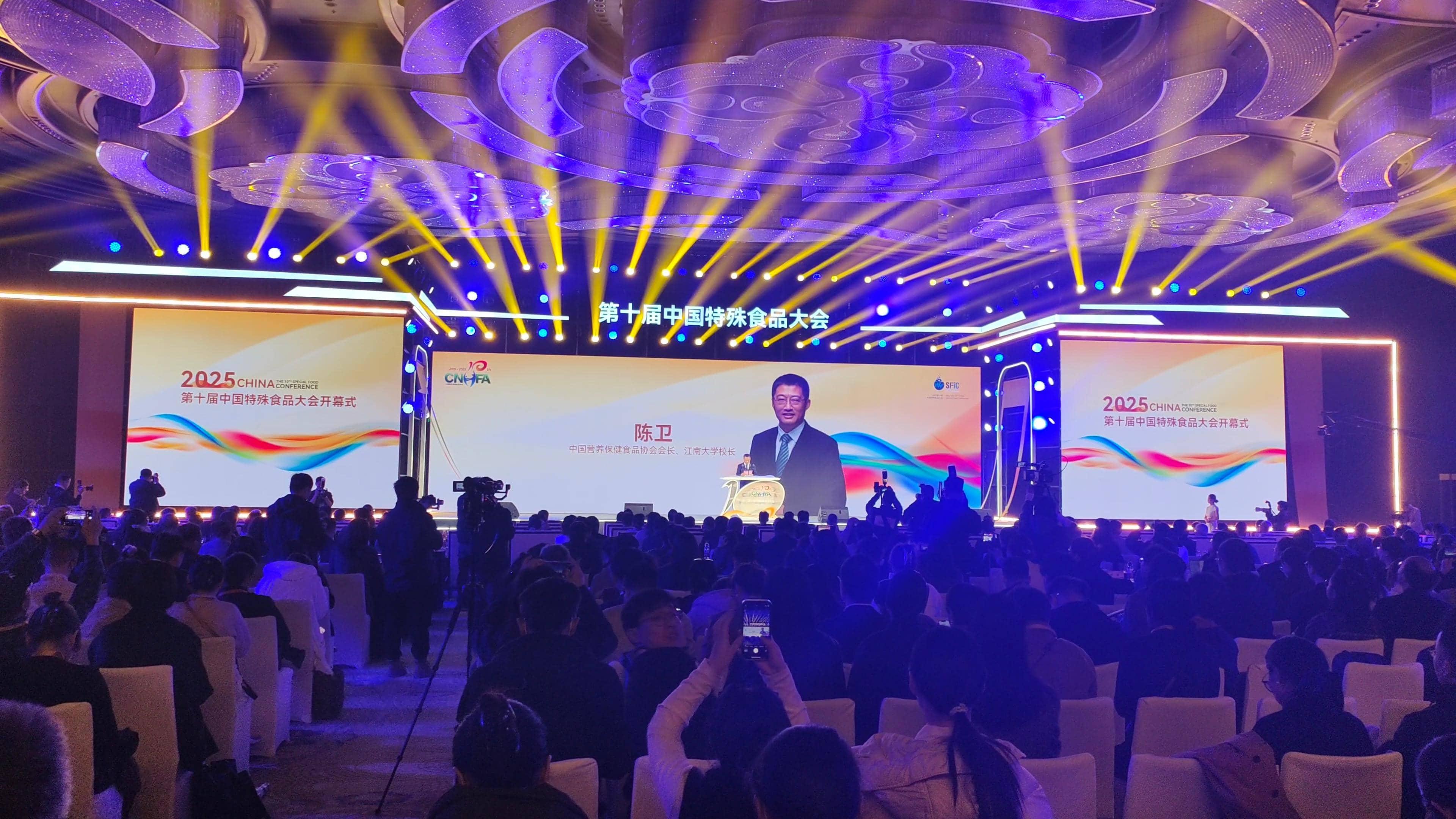 中國營養保健食品協會會長、江南大學校長陳衛代表主辦單位致歡迎詞時指出,中國營養保健食品協會始終與行業同頻共振。堅持科學為本,夯實創新基石;筑牢安全底線,打造責任閉環;促進跨界融合,拓展產業邊界。未來將堅持以“‘拾’光織錦 不啻微芒”的精神,與業內外同仁一道共同開啟中國特殊食品行業的新篇章。