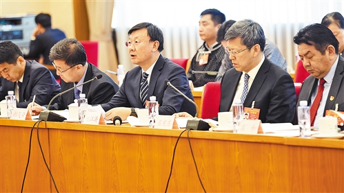 上圖 3月12日,人大內蒙古代表團舉行全體會議。全國人大代表、內蒙古自治區包頭市市長趙江濤(中)表示,生態文明建設利國利民。 本報記者 李景錄攝
