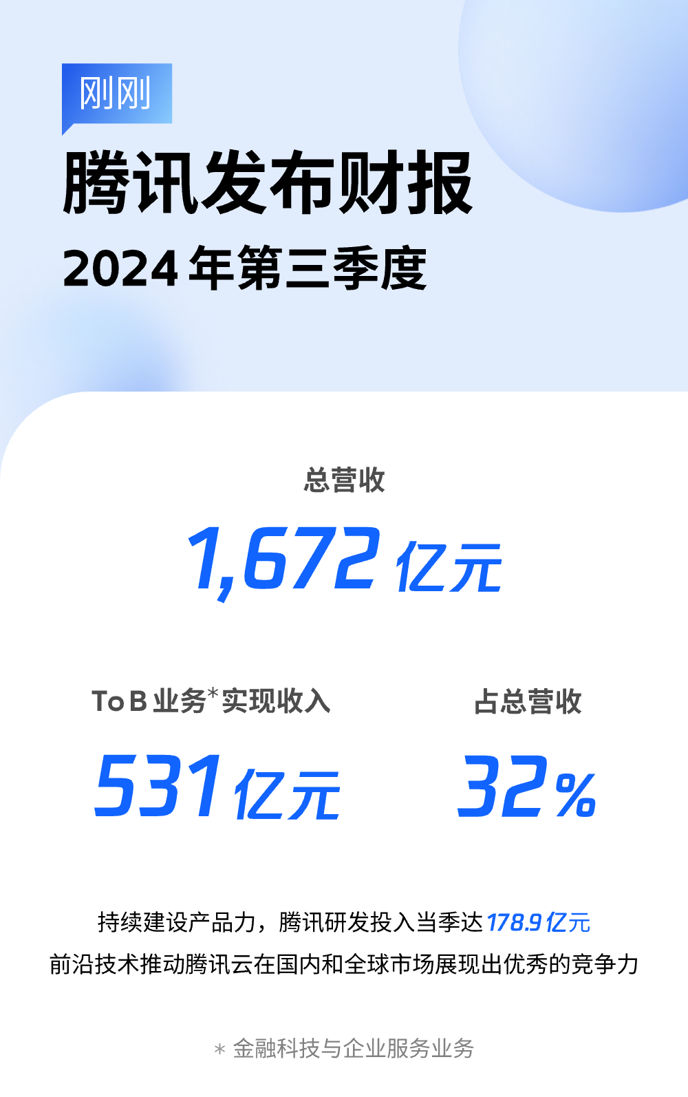中國經濟網北京11月14日訊(記者 李方) 11月13日,騰訊發布2024年Q3財報,當季度騰訊總營收1672億元,同比增長8%。騰訊ToB業務(金融科技及企業服務)實現營收531億元,占騰訊總營收的32%。其中,企業服務的收入增長受益于云服務和商家技術服務費推動,毛利受益于結構優化、效率提升獲得顯著增長。