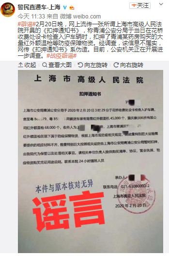 經(jīng)濟(jì)日?qǐng)?bào)-中國(guó)經(jīng)濟(jì)網(wǎng)2月22日訊 (記者 朱國(guó)旺 郭文培) 2月20日晚,網(wǎng)上流傳一張所謂上海市高級(jí)人民法院開具的《扣押通知書》,稱青浦公安分局于當(dāng)日(20日)在花橋收費(fèi)處設(shè)卡檢查入滬車輛時(shí),扣押了青浦某藥房購(gòu)買的大量紅外額溫槍等防疫保障物資。