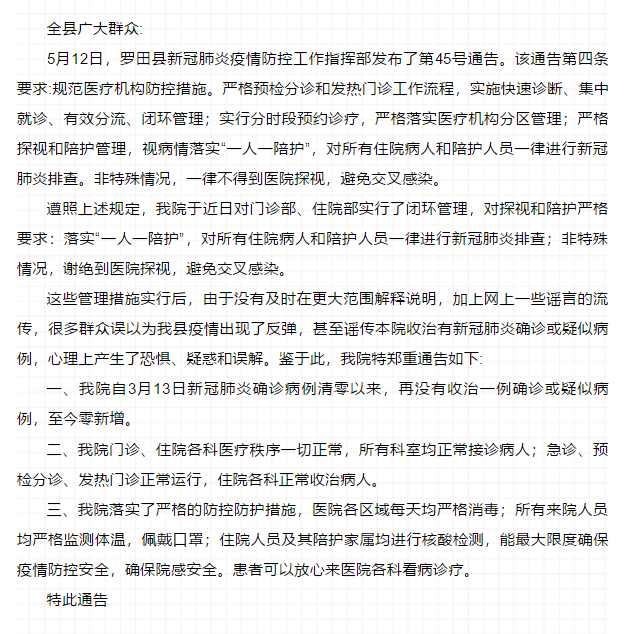 針對近日湖北羅田縣人民醫院收治新冠肺炎確診病例等傳言,5月22日,羅田縣人民醫院發布《關于本院疫情防控和醫療秩序一切正常的通告》辟謠稱,該院自3月13日新冠肺炎確診病例清零以來,再沒有收治一例確診或疑似病例,至今零新增。目前,該院門診、住院各科醫療秩序一切正常,所有科室均正常接診病人;急診、預檢分診、發熱門診正常運行,住院各科正常收治病人。