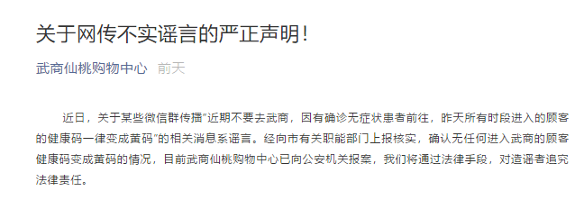 據武商仙桃購物中心管理有限公司官微5月23日消息,近日,關于某些微信群傳播“近期不要去武商,因有確診無癥狀患者前往,昨天所有時段進入的顧客的健康碼一律變成黃碼”的相關消息系謠言。經向市有關職能部門上報核實,確認無任何進入武商的顧客健康碼變成黃碼的情況,目前武商仙桃購物中心已向公安機關報案,將通過法律手段,對造謠者追究法律責任。