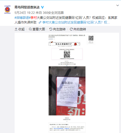 據半島都市報官微5月24日報道,針對“發現一名健康通行碼紅碼人員”一事,經落實,系其家人操作失誤所致,該名人員實際持有綠碼,無健康問題。此外,5月24日,山東省青島市公安局網絡警察支隊官方微博也對此傳言進行了辟謠。