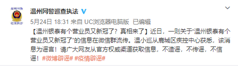 據@溫州網警巡查執法5月24日消息,從鹿城區疾控中心獲悉,網傳“溫州銀泰有營業員感染新冠病毒”系謠言。請廣大網友從官方權威渠道獲取信息,不造謠,不傳謠,不信謠。