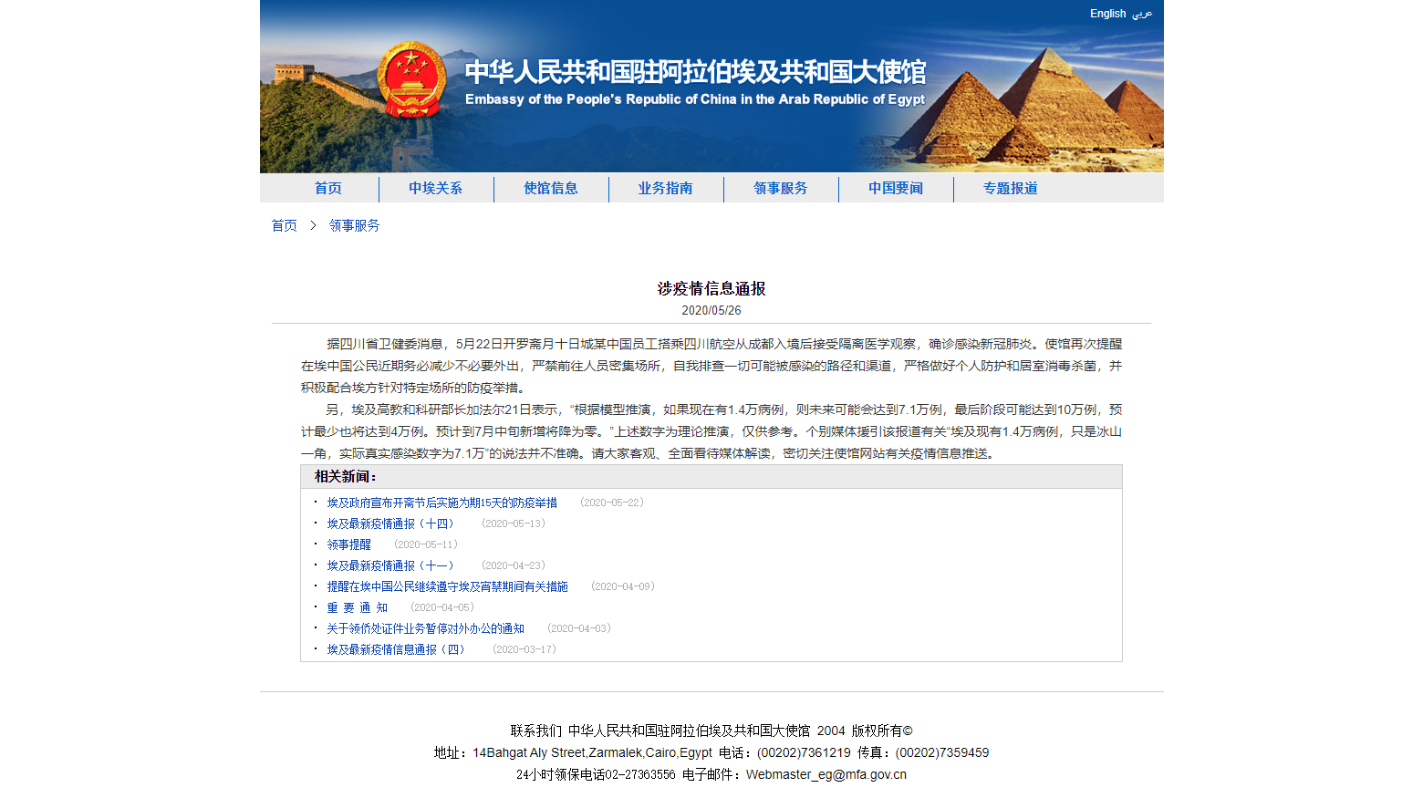 此外,駐埃大使館提醒,據四川省衛健委消息,5月22日開羅齋月十日城某中國員工搭乘四川航空從成都入境后接受隔離醫學觀察,確診感染新冠肺炎。使館再次提醒在埃中國公民近期務必減少不必要外出,嚴禁前往人員密集場所,自我排查一切可能被感染的路徑和渠道,嚴格做好個人防護和居室消毒殺菌,并積極配合埃方針對特定場所的防疫舉措。