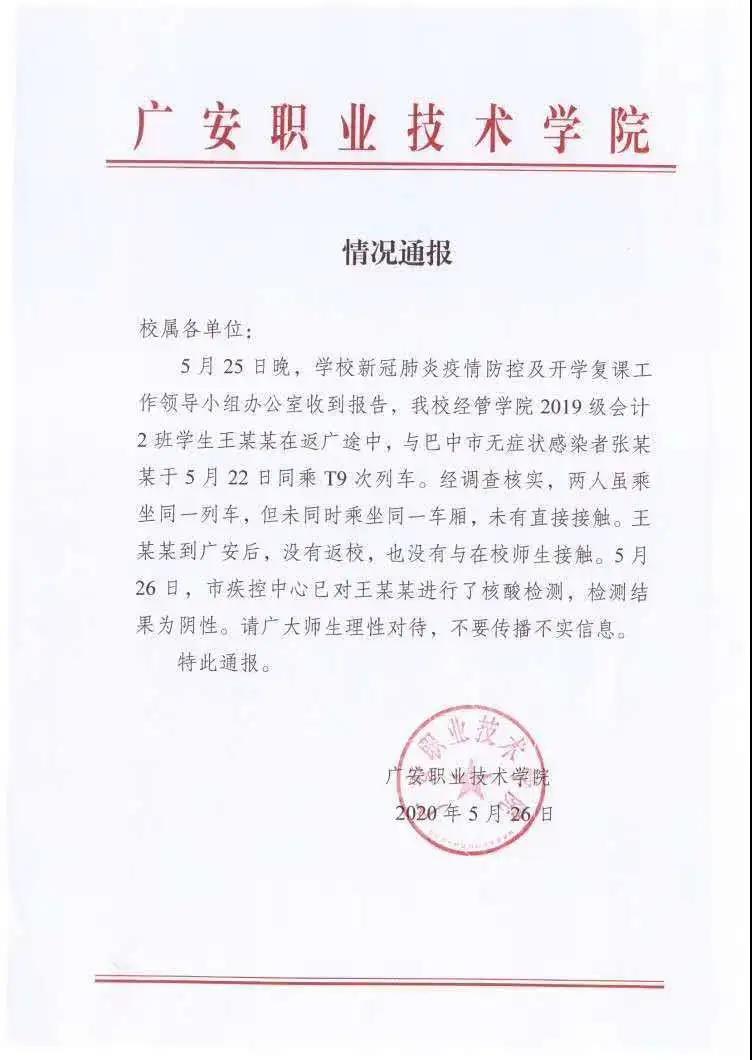 公告稱, 5月25日晚,廣安職業技術學院新冠肺炎疫情防控及開學復課工作領導小組辦公室收到報告,該校經管學院2019級會計2班學生王某某在返廣(安)途中,與巴中市無癥狀感染者張某某于5月22日同乘T9次列車。經調查核實,兩人雖乘坐同一列車,但未同時乘坐同一車廂,未有直接接觸。王某某到廣安后,沒有返校,也沒有與在校師生接觸。5月26日,廣安市疾控中心對王某某進行核酸檢測,檢測結果為陰性。