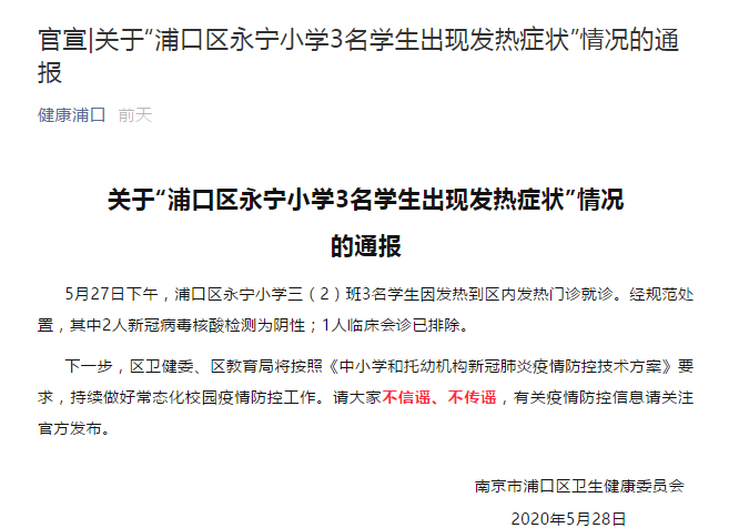針對網絡傳言“南京浦口永寧小學發生聚集性疫情,導致全班停課。”5月28日, 南京市浦口區衛生健康委員會官微“健康浦口”發布《關于“浦口區永寧小學3名學生出現發熱癥狀”情況》澄清事實。