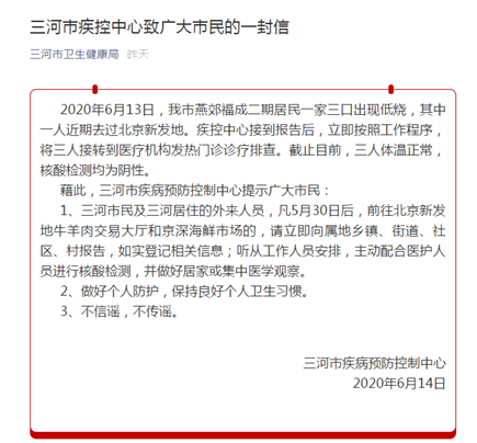 此外,針對三河市燕郊福成二期居民一家三口出現低燒,其中一人近期去過北京新發地一事,6月14日,三河市疾病預防控制中心對此做出回應。三河市疾病預防控制中心表示,接到報告后,便立即按照工作程序,將三人接轉到醫療機構發熱門診診療排查。截止目前(14日),三人體溫正常,核酸檢測均為陰性。
