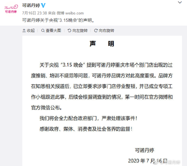 昨日晚間,可諾丹婷針對 315 晚會報道作出回應??芍Z丹婷表示,關于央視“3.15晚會”提到可諾丹婷重慶市場個別門店出現的過度推銷、培訓不規范等問題,可諾丹婷品牌方對此高度重視。品牌方在知悉相關報道后,已立即要求涉事門店停業整頓,并已成立專項工作小組跟進此事,后續會根據調查到的情況,第一時間在官方微博和官方微信公布。