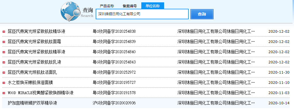 記者通過國產非特殊用途化妝品備案平臺查詢得知,深圳綿儷日用化工有限公司是屈臣氏燕窩光妍緊致肌肽精華液、歐薇蔻肌肽水光晶致面膜、護加宜精研臻護雙萃精華液等800多款產品的生產企業。