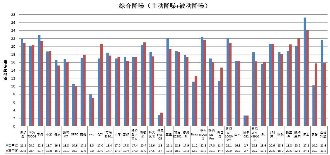 無線耳機(jī)的降噪性能包含耳機(jī)聽音的降噪性能和麥克風(fēng)拾音的降噪性能,均通過耳機(jī)綜合降噪(主動(dòng)降噪+被動(dòng)降噪)和通話降噪兩項(xiàng)指標(biāo)呈現(xiàn)。