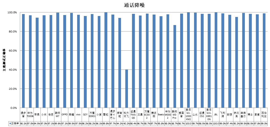 本次比較的36款無線耳機(jī)中,通話降噪能力出色的是索尼(WI-1000XM2)和JBL哈曼,接聽記錄錯(cuò)誤率0%,通話降噪效果好,完全沒有受到噪聲影響,接聽語音非常清晰;2款無線耳機(jī)降噪能力比較弱,接聽記錄錯(cuò)誤率超過10%,分別為科大訊飛和酷狗(酷狗M3 Pro)耳機(jī),通話降噪欠佳的耳機(jī)在噪聲環(huán)境下,如地鐵、火車站、餐廳等地點(diǎn)通話,會(huì)導(dǎo)致對(duì)方收音不清晰,無法正常交流。