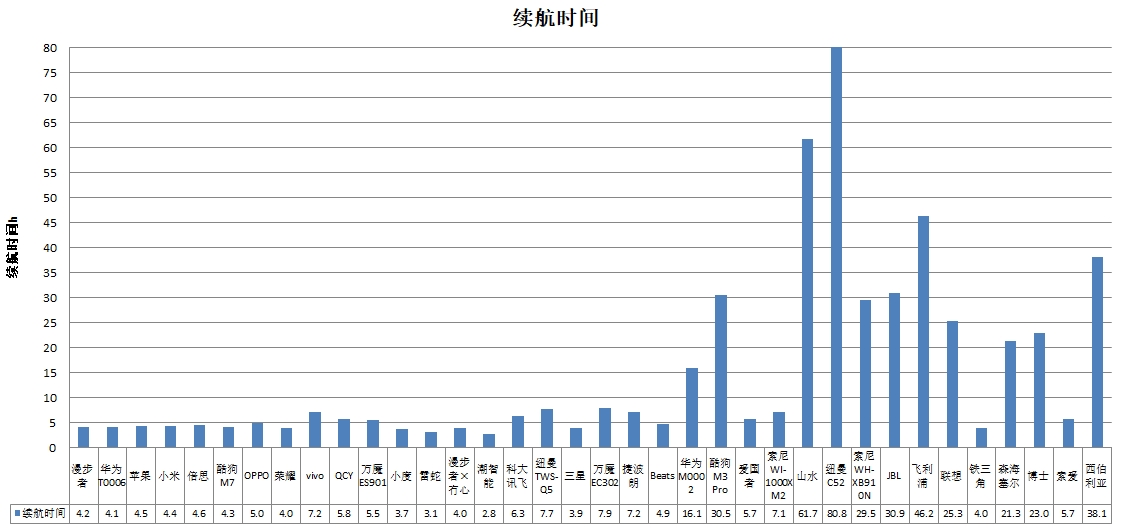 無線耳機(jī)的續(xù)航能力由無線耳機(jī)的續(xù)航時(shí)間和充電時(shí)間兩項(xiàng)指標(biāo)呈現(xiàn),各種類型的耳機(jī)有很大差別。