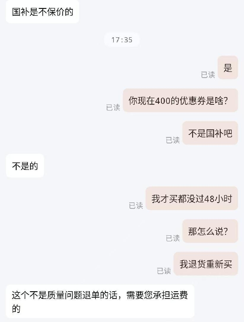 面對這突如其來的降價,李先生深感憤怒與無奈。他嘗試通過平臺客服協調退還差價,但得到的答復卻是:由于產品享受了政府補貼,差價不予退還。李先生氣憤地表示:“有種被當傻子耍的感覺。”經過多次溝通,李先生最終與客服協商達成了無條件退貨的協議,退貨運費由平臺承擔。隨后,李先生又用家人的賬號領取政府補貼后,加上新的活動優惠,以低于原購買價500元的價格于同一網購平臺再次購買了同一款空氣凈化器。