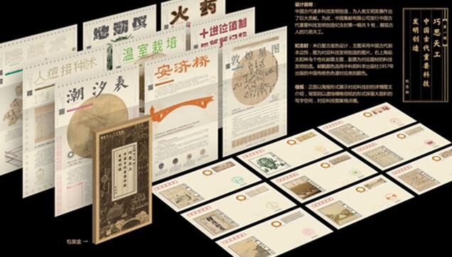 該系列紀念封由張泮儉、張慶鋒設計,風格整體統一又有特色,兼具科學與藝術之美,既能感受到傳統文化的古香古色,又在設計和制作上大膽創新。每類郵戳對照中國傳統色色譜進行色系標注,顏色有所區別。紀念封配有精美封套,通過主圖、郵戳、個性化郵票直觀表現科技成果,同時在封里增加了一張設計精良的三折插頁卡片——頁式“說明書”,掃描封上二維碼,還可以觀看動畫短片,參與互動游戲。