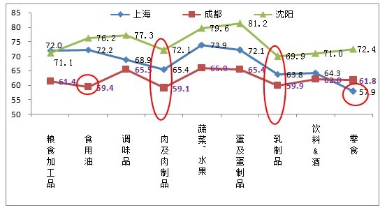 針對食品安全現狀信心指數較低的三個城市:上海、成都、沈陽。沈陽表現相對較好,信心指數較高;其次是上海;最低的是成都。其中肉及肉制品和乳制品在三大城市中的安全信心指數都相對偏低,直接影響了三大城市的綜合信心程度。此外,食用油在成都的安全信心指數、零食在上海的安全信心指數也有待提高。