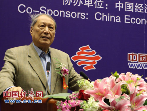 中國科學院預測科學研究中心1月26日(周五)在北京中科院數學與系統科學研究院舉辦“2013年中國經濟預測發布與研討會”。圖為中國科學院預測科學研究中心學術委員會主任 第七、八屆全國人大副委員長成思危致辭。中國經濟網楊瀟/攝影