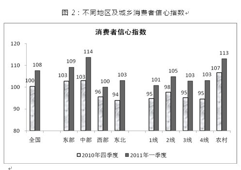 2011年一季度中國消費者信心指數為108,比2010年四季度大幅上升8點,接近近兩年高點。消費者對當前經濟形勢的滿意度和對未來經濟走勢的預期樂觀度均明顯上升,持樂觀態度的消費者比重均接近兩年內的最高點。